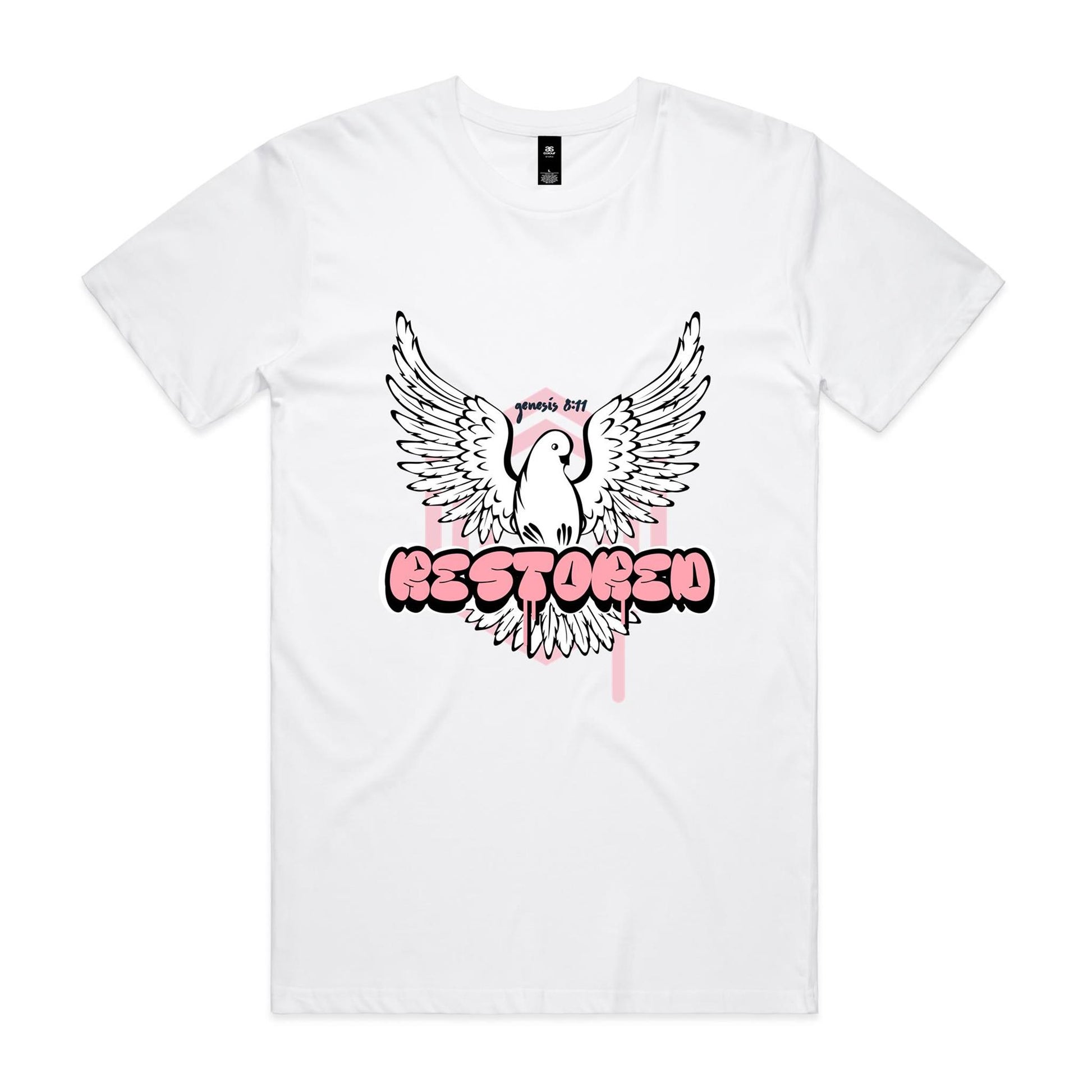 The RESTORED TEE carries the quiet power of a comeback — the kind that only God can author. Front and center is a beautifully drawn dove, wings stretched wide in a posture of peace, promise, and new beginnings. Behind it, soft geometric shapes and smooth graffiti textures mix heavenly calm with street-style edge, creating a look that speaks restoration with boldness.